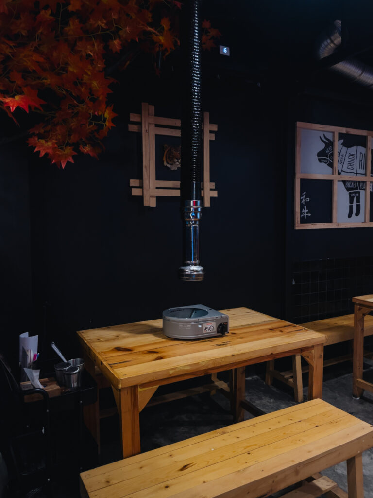 ตัวร้านตกแต่งในสไตล์ลอฟต์ผสมกลิ่นอายญี่ปุ่น มีความเท่แบบบาร์ญี่ปุ่นข้างทาง โต๊ะไม้ ตะแกรงย่าง ปิ้งเองร้อน ๆ ควันเบา ๆ พอชื่นใจ จะมากับเพื่อน ครอบครัว หรือดินเนอร์เบา ๆ กับคนรู้ใจก็เหมาะทุกแบบ
